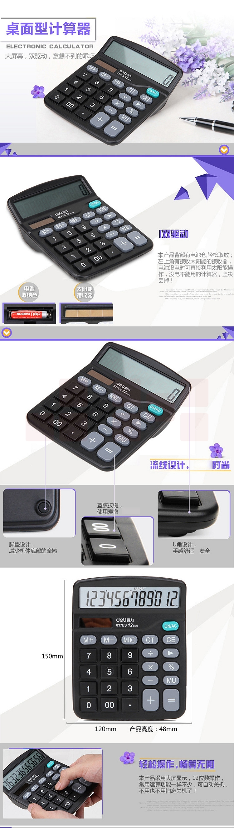 得力 双电源 计算器 12位大屏幕桌面计算机837ES