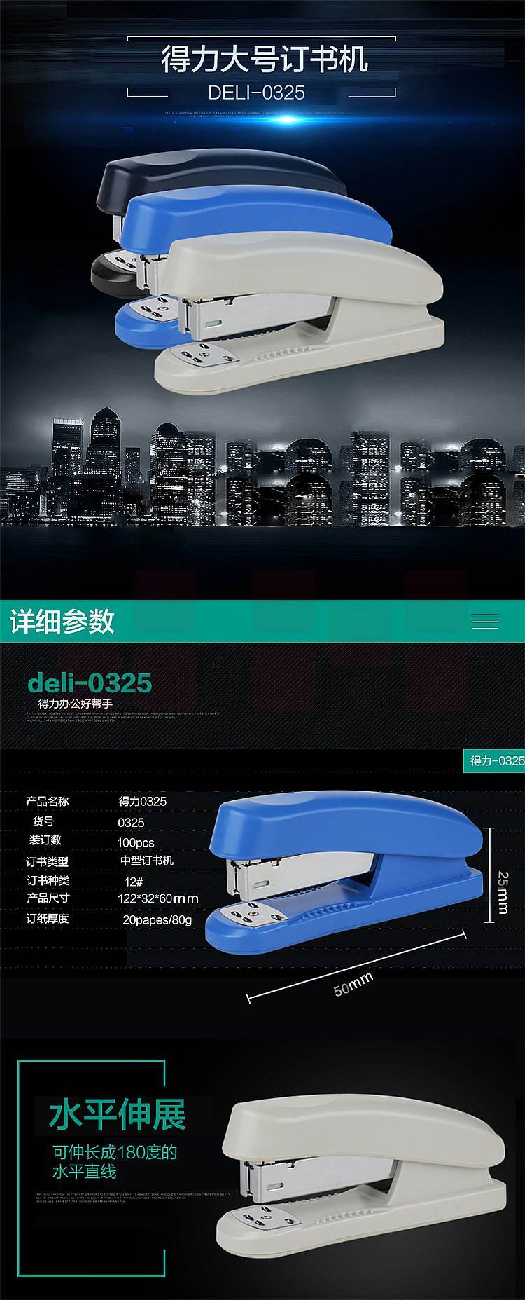 得力0325订书机12号订书器可订20页 蓝色