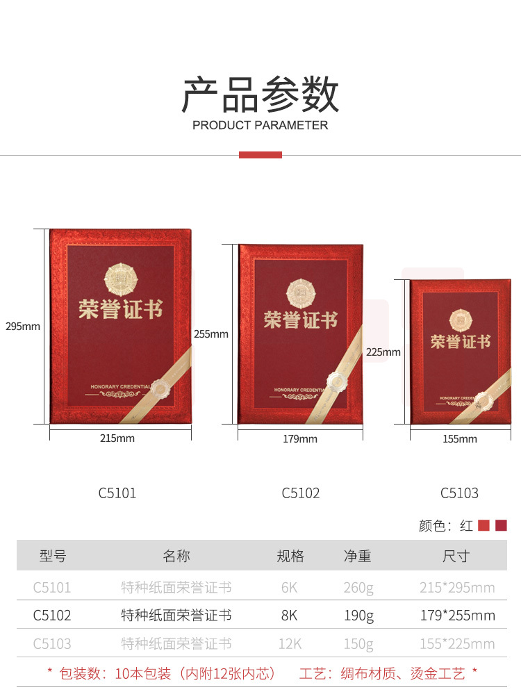 齐心 C5102 荣誉证书 附证书内芯 8K 10本/盒 按盒销售