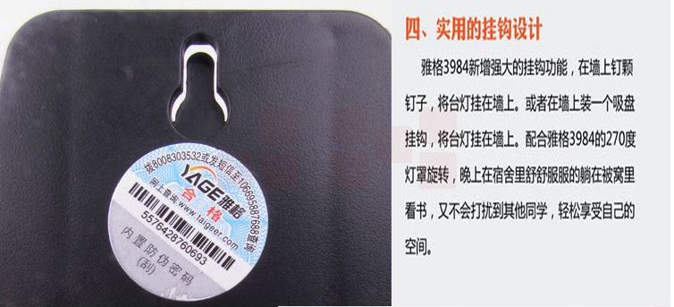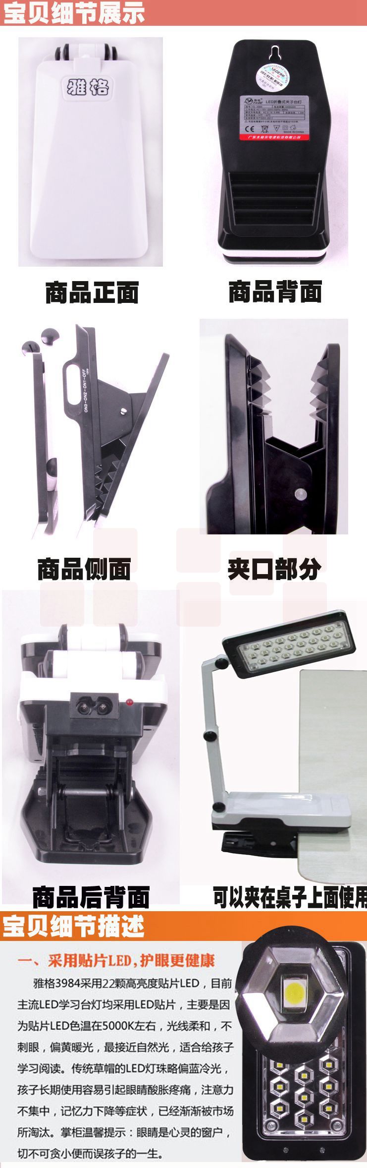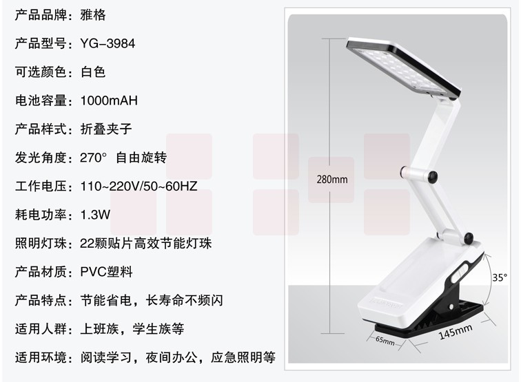 雅格(YAGE)3984 充电式LED夹子台灯灯罩自由旋转