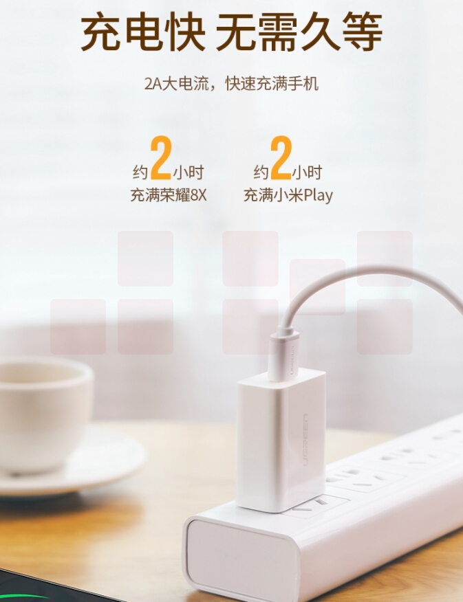 绿联 安卓数据线 充电线 2A快充Micro USB充电器线转接头 通用华为小米vivo/oppo三星荣耀手机0.5米10847 白