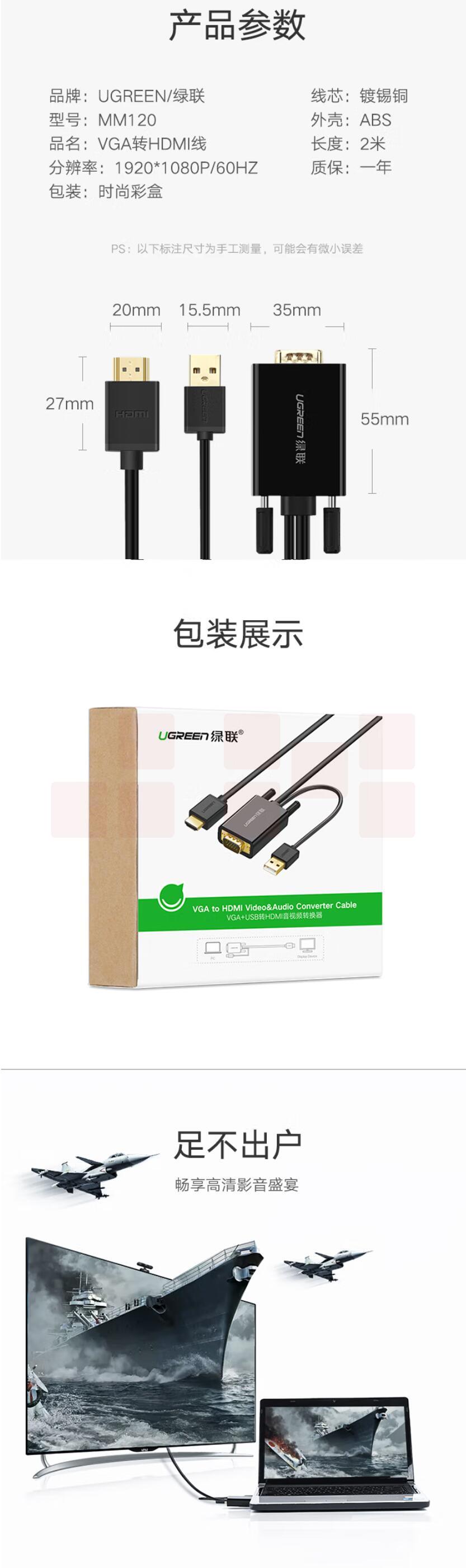 绿联 VGA转HDMI高清转换器线支持音视频同步 2米高清转换器线 MM120/30840