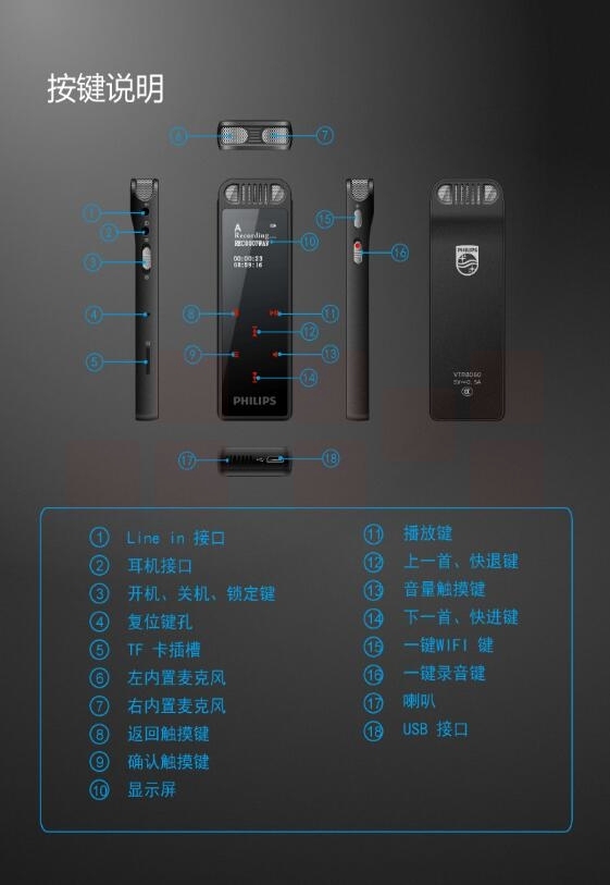 飞利浦(PHILIPS)VTR8060 16GB 会议 学习记录 WIFI 语音转文本 APP文件传输分享 智能数字降噪录音笔 蓝色