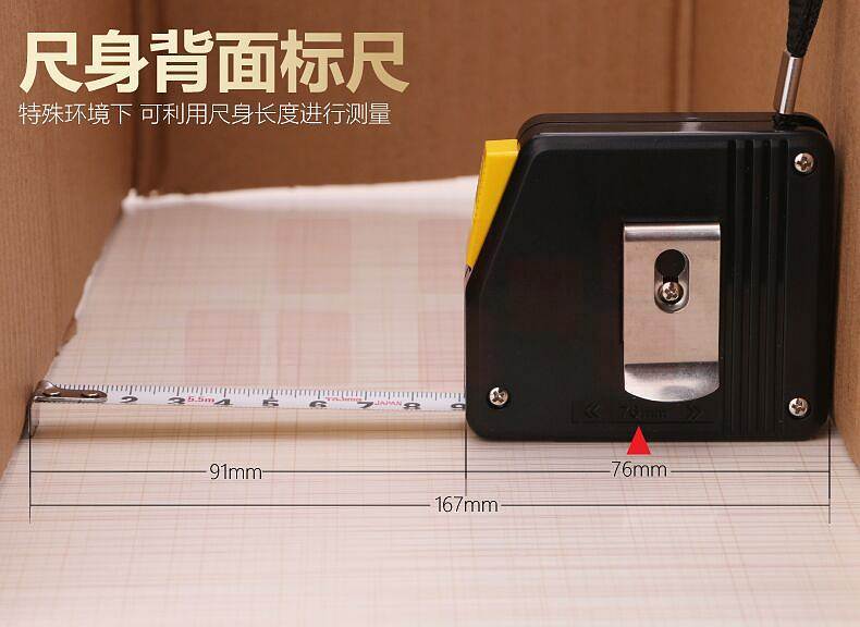 品牌:日本田岛; 尺寸:尺带5.5M*19mm; 材质:尺带进口SK85钢,弹簧进口SK85钢,尺壳亚克力树脂以及聚碳酸脂树脂,JIS1级,垂平气泡管,内部测量,印记边款以及锁定机构减震器,测量更精密,简单,方便; 包装规格:6把/盒/60把/箱;