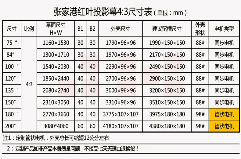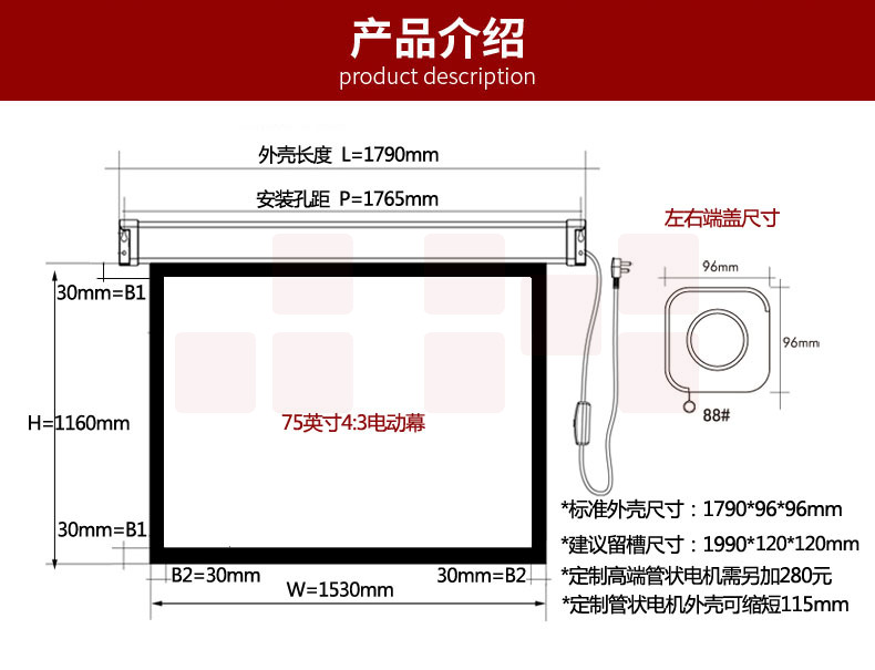 1.53*1.16 全新正品 质保一年 方管加厚外壳 电动投影幕75寸4:3白玻纤 玻珠 白塑幕布