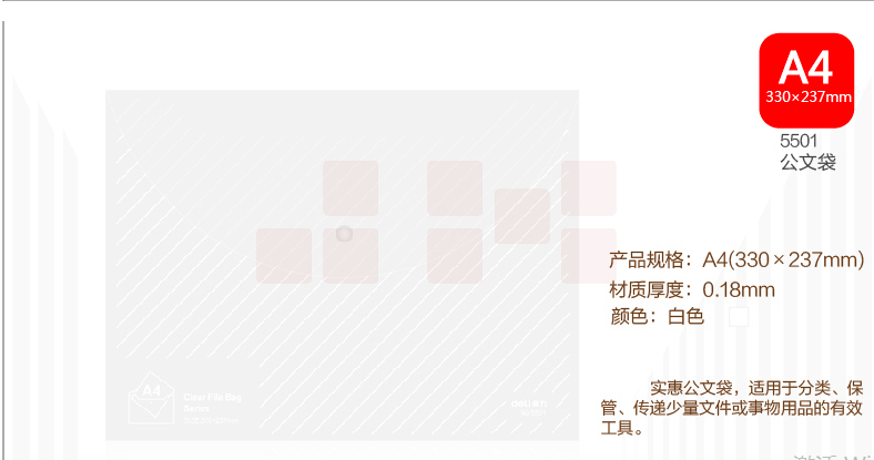 得力 5501透明丝印按扣公文袋A4 文件袋 (白) 10只装
