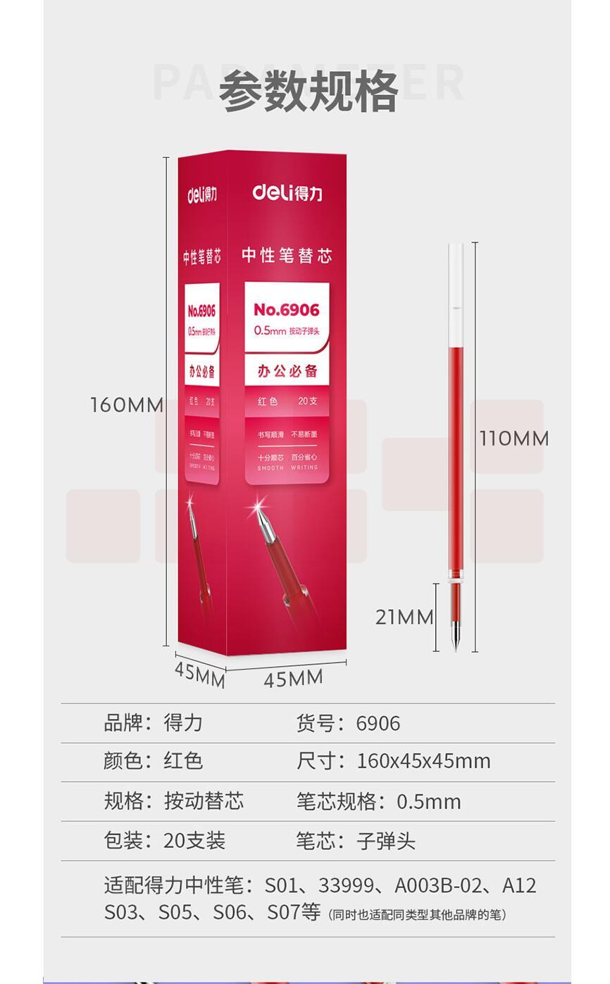 得力 6906 中性笔芯 红色 0.5mm 20支/盒 适用中性笔S01