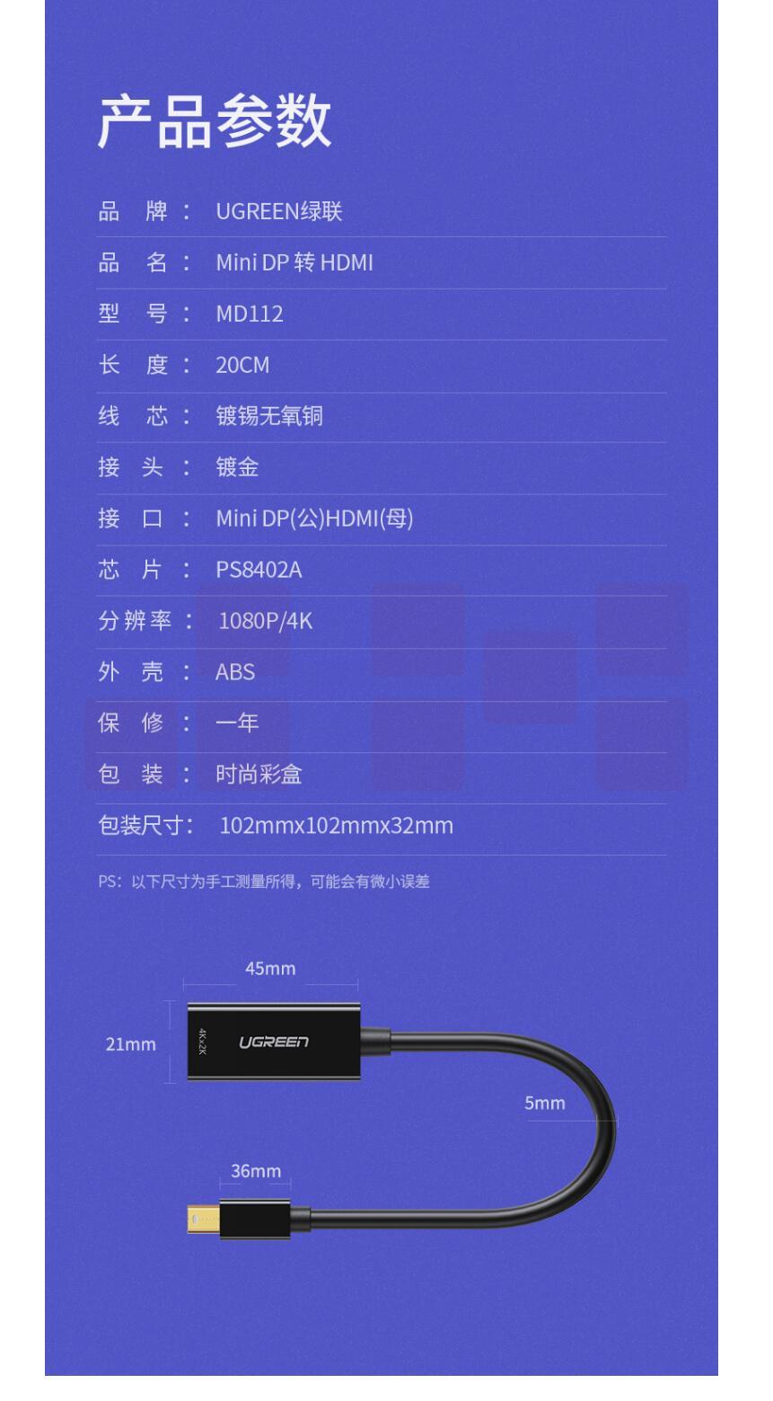 绿联mini dp转HDMI母转接线 0.2m