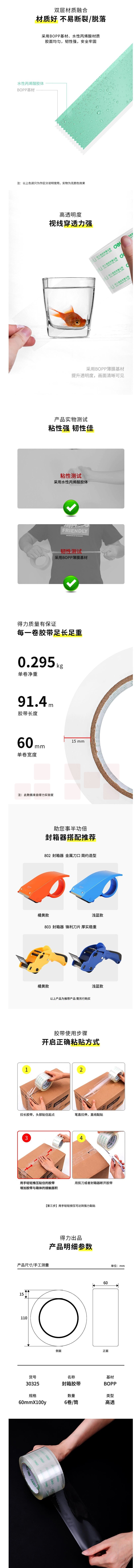 得力/deli 30325 高透明封箱胶带 60mm*100y*50um(91.4m/卷) 6卷/筒