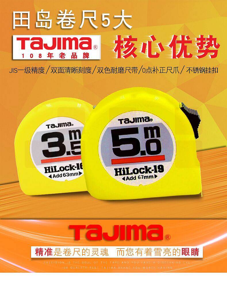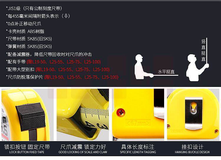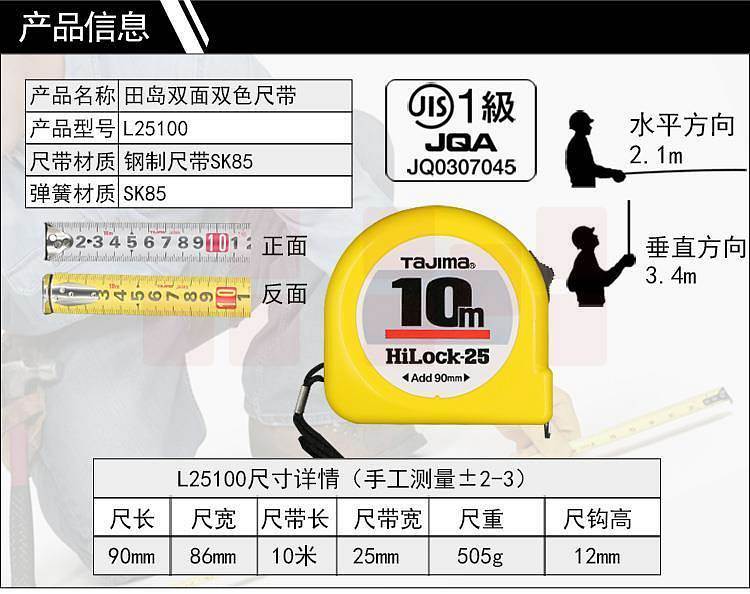 品牌:日本田岛; 尺寸:尺带10M*25mm; 材质:尺带进口SK85钢,弹簧进口SK85钢,尺壳ABS树脂,JIS1级,0点补正移动尺爪,手动锁定,配减震器,测量精密,简单,方便,轻巧; 包装规格:6把/盒/60把/箱;