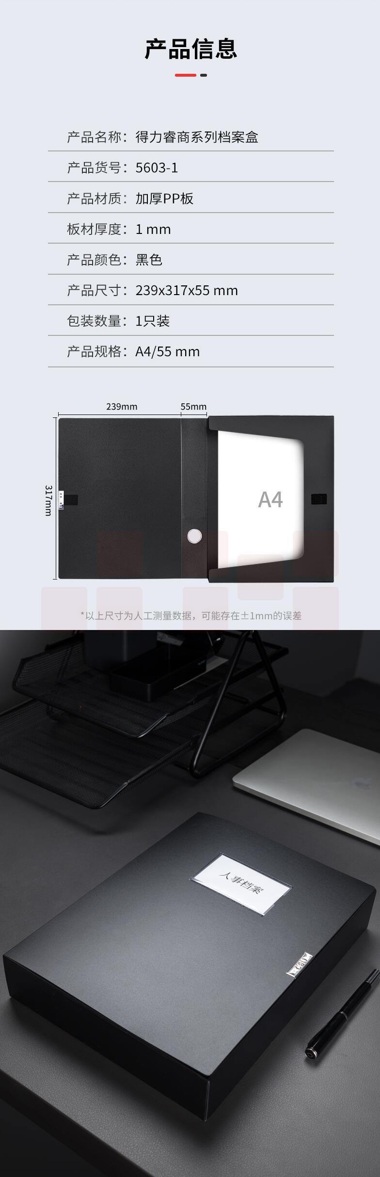 得力 5603 A4档案盒 黑色 文件资料盒 (单位:只)239x 317x55mm