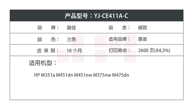 盈佳YJ CE411A(305A)兰鼓(带芯片) 适用机型:HP M351a M451dn M451nw M375nw M475dn