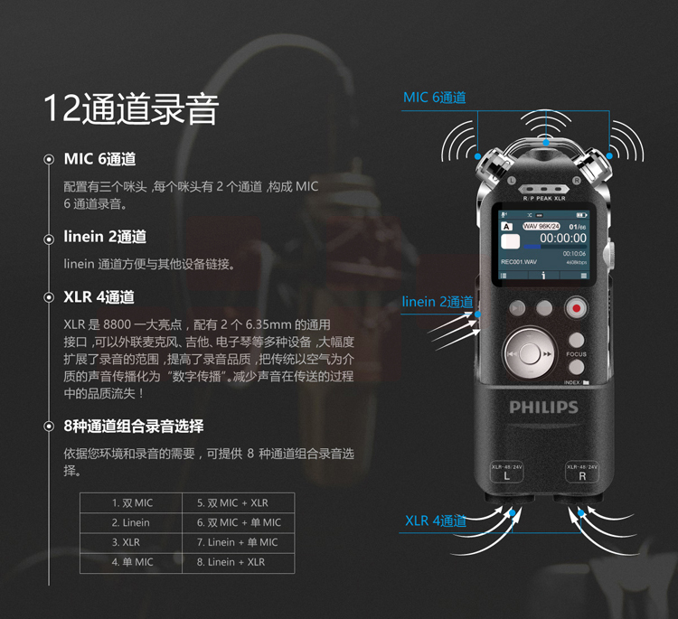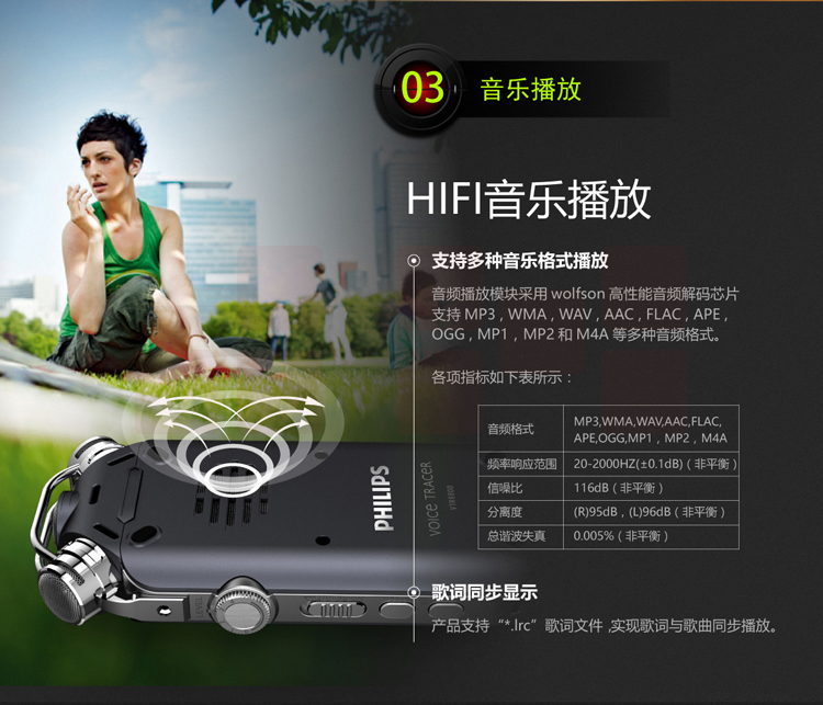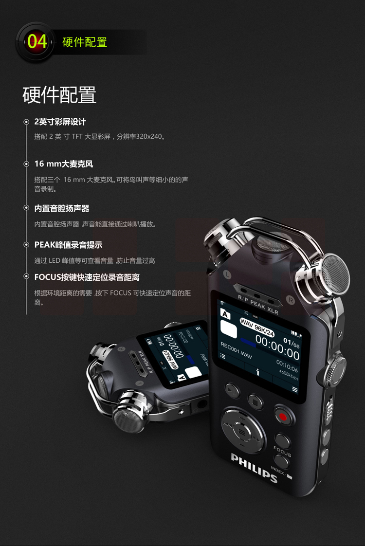 飞利浦(PHILIPS)VTR8800 16G 高端精选 录音笔 12通道发烧HIFI音乐播放器