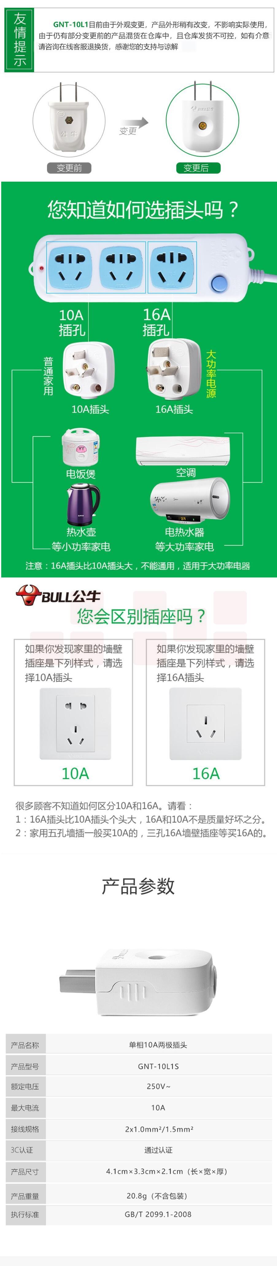 公牛 10A二极插头 二眼插头 GNT-10L1S 二脚插头 220v
