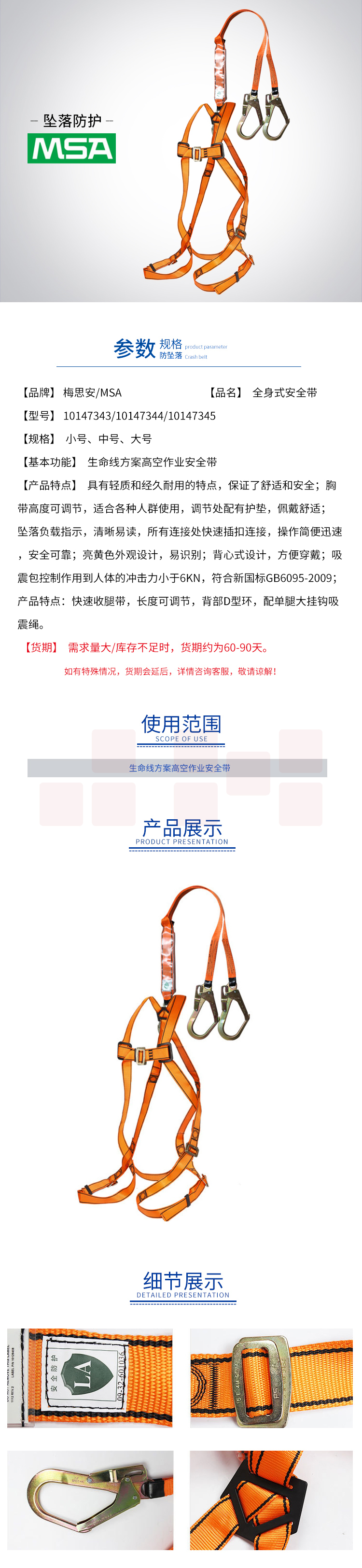 梅思安/MSA 10147344全身式安全带 高空作业 快速收腿带背D型环双腿大挂钩吸震绳