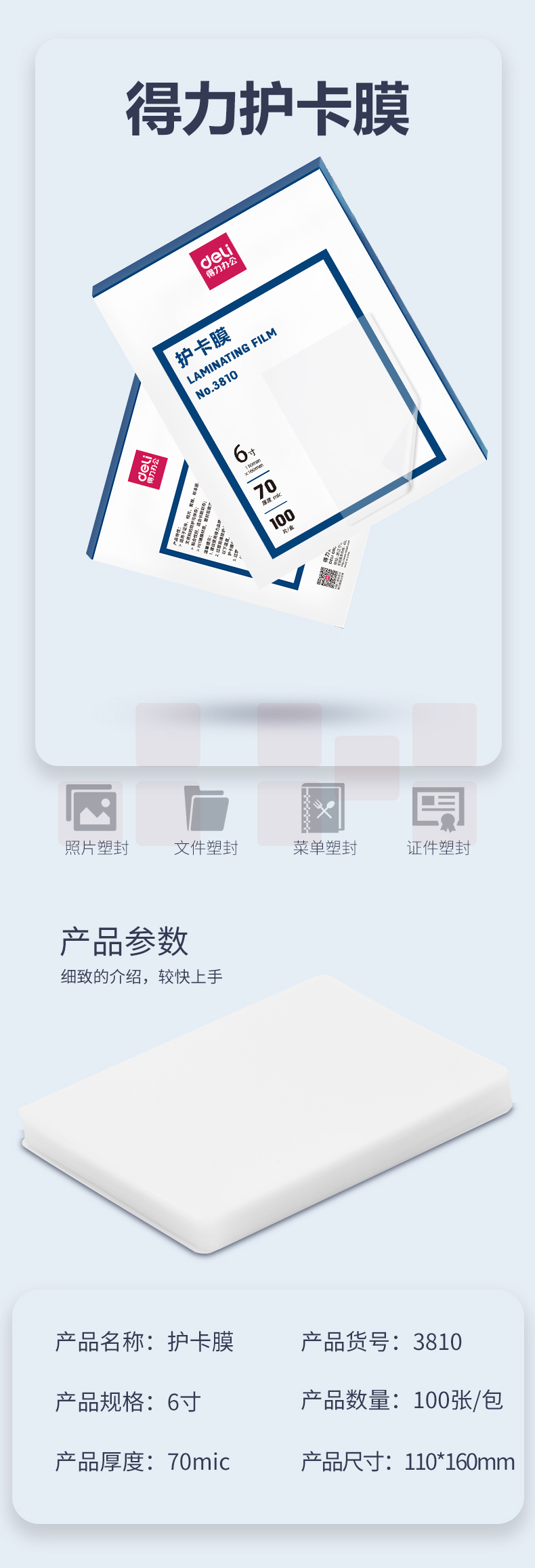 得力3810 过塑膜 塑封膜护卡膜 照片文件过塑膜透明 【6寸 100张】厚度70mic