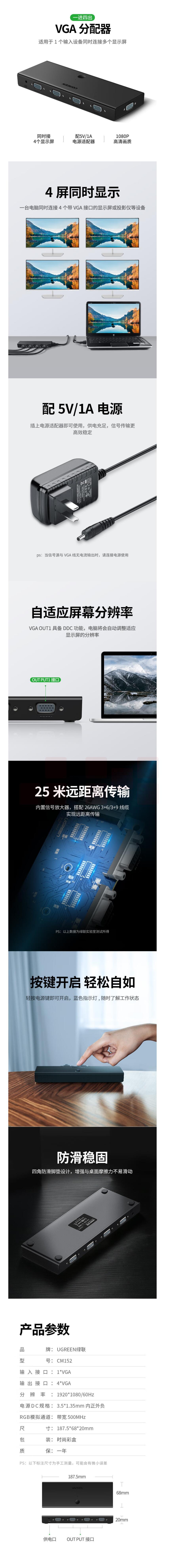绿联 VGA分配器一分四 高清视频1进4出分屏器 50292