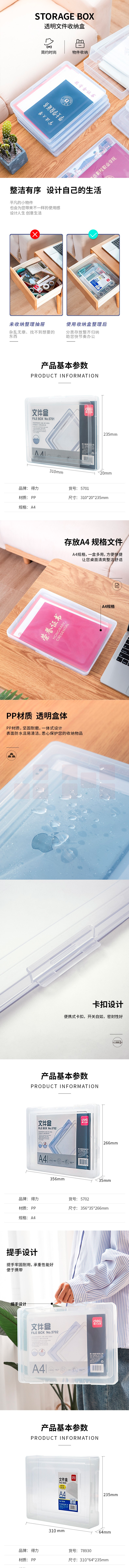 得力 5702 A4透明文件盒 整理资料收纳盒 356*35*266mm