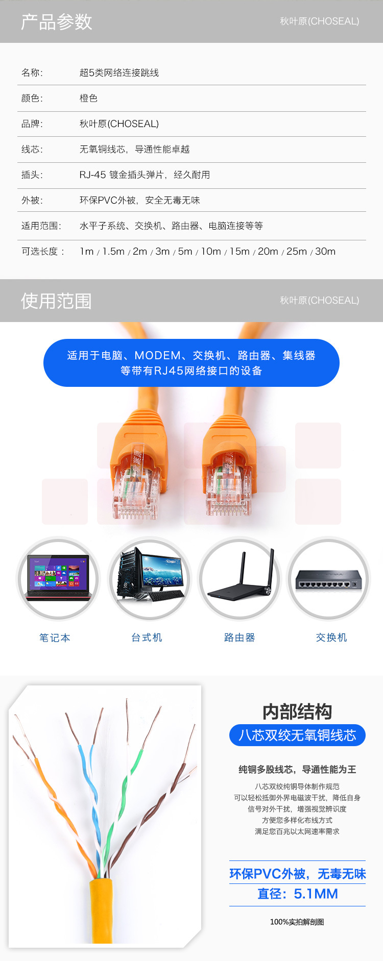 秋叶原(CHOSEAL)高速超五类网线 网络线连接线 带水晶头网络跳线 15米
