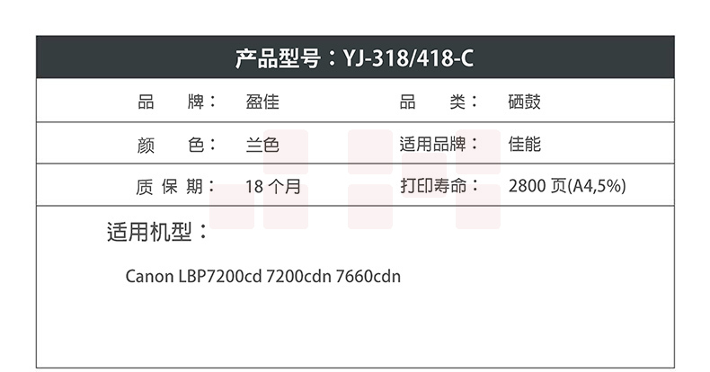 盈佳YJ CN-318/418兰鼓(带芯片) 适用佳能LBP7200cd/7200cdn/7660cdn