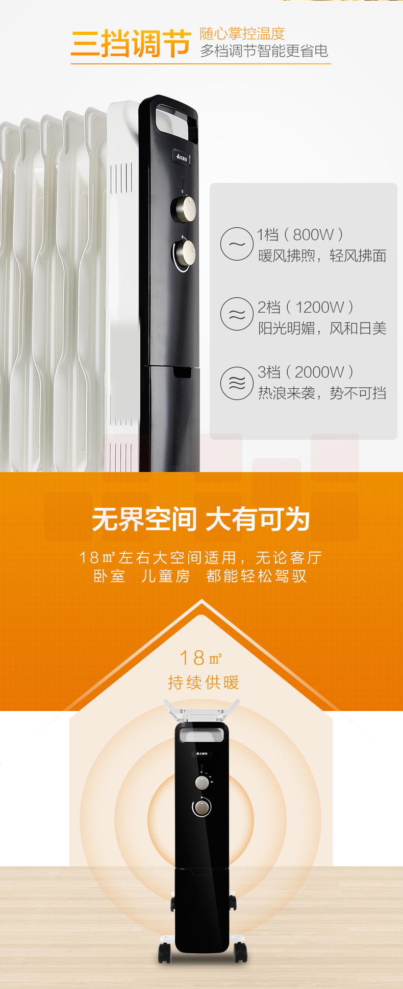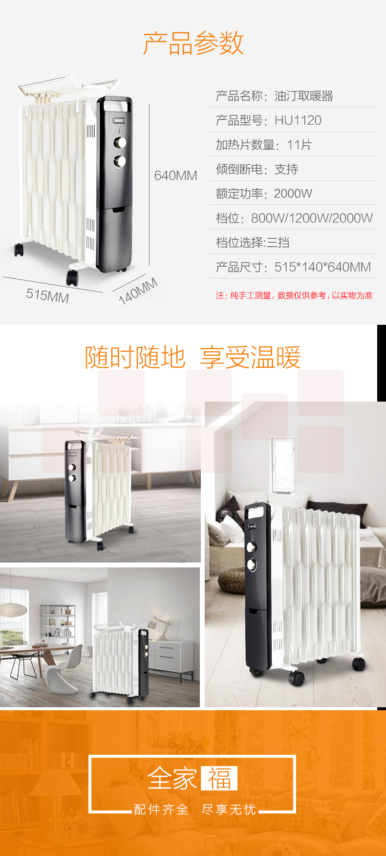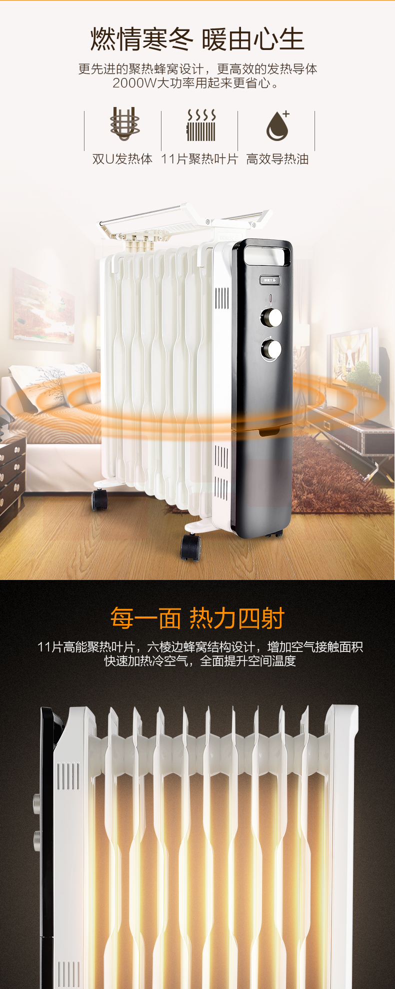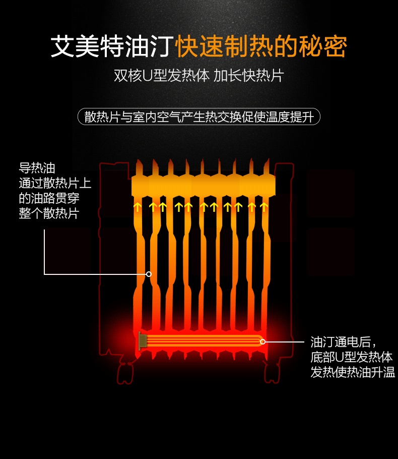 艾美特(AIRMATE)11片 HU1120油汀取暖器 三档调温办公室节能省电
