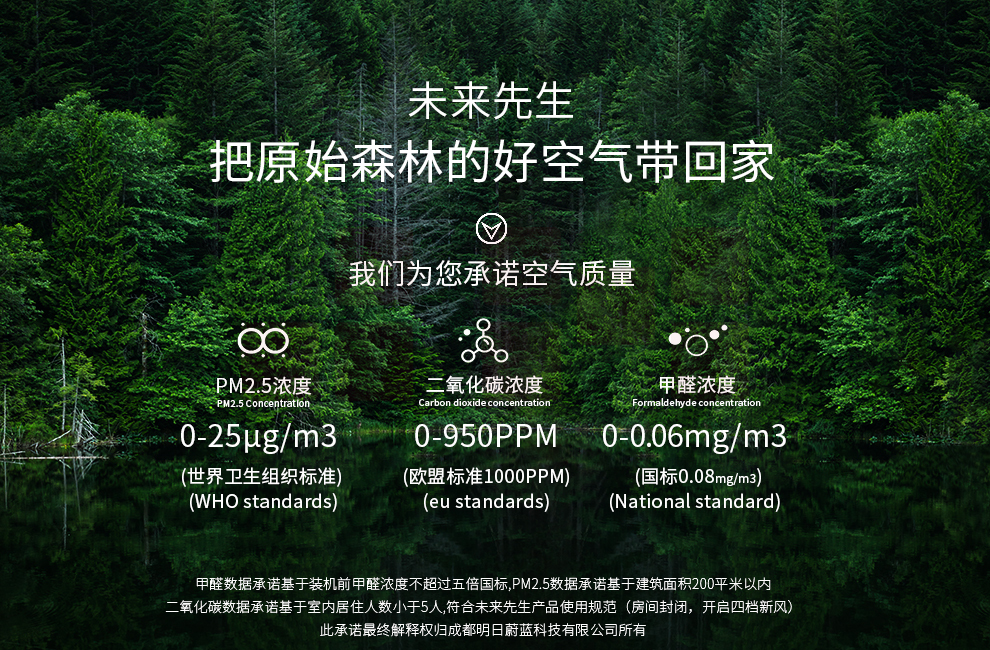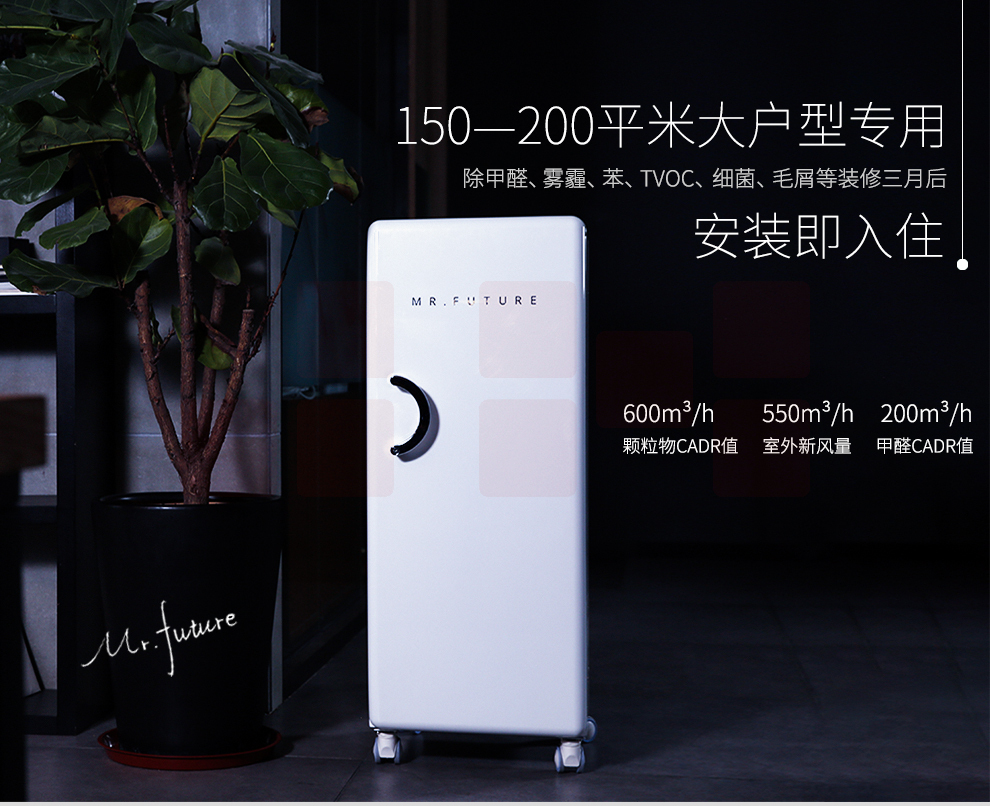 值、550m³/h的新风量,每天为家灌溉1280万升的森林级空气。极速的净化能力,让每台MR.FUTURE®未来先生适用于200平米左右的空间,每12分钟对空间彻底净化一次,顷刻间让房间仿佛置身于森林般的清新中"