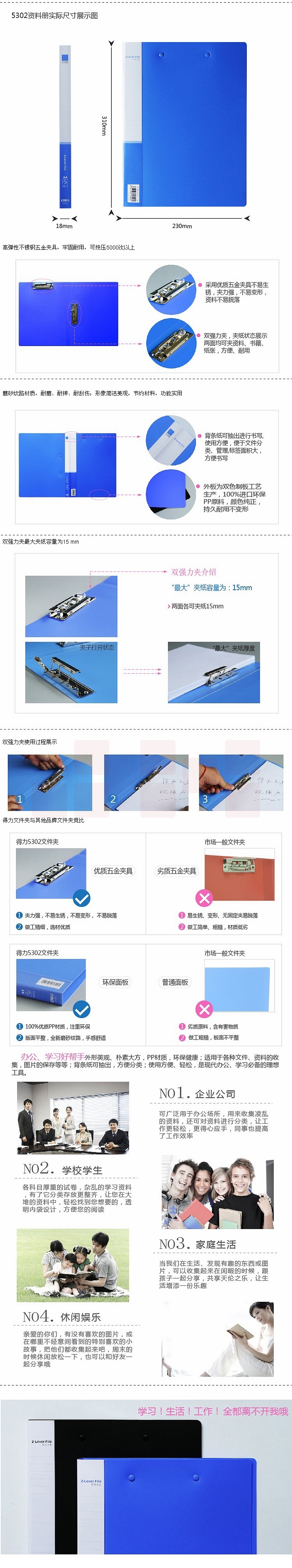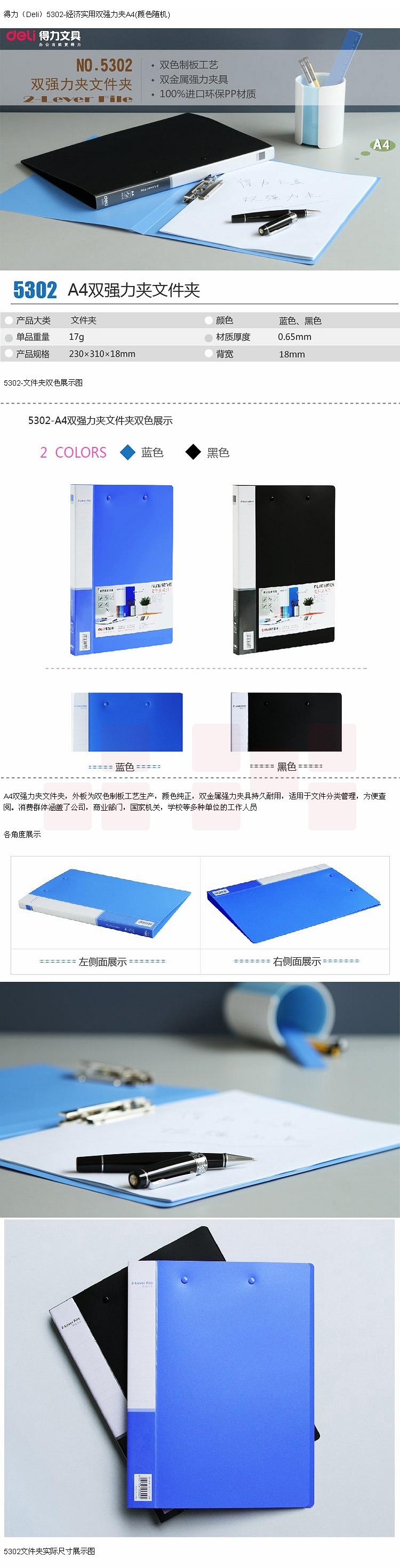 得力 5302 文件夹A4双强力夹315*235*18mm 黑 (单位:只)
