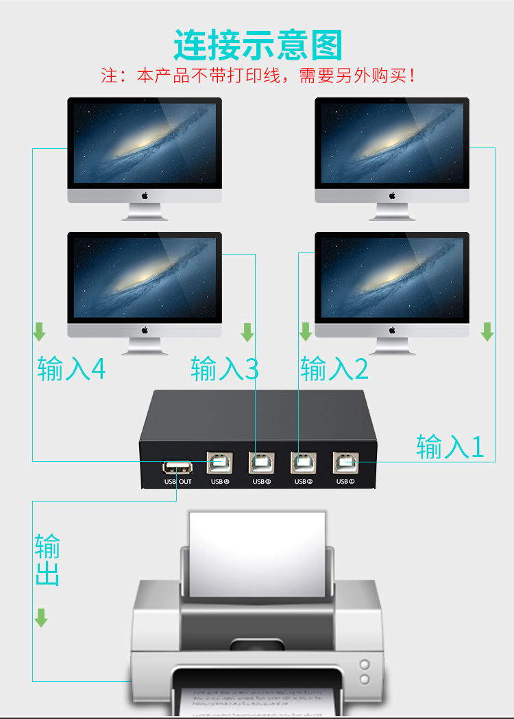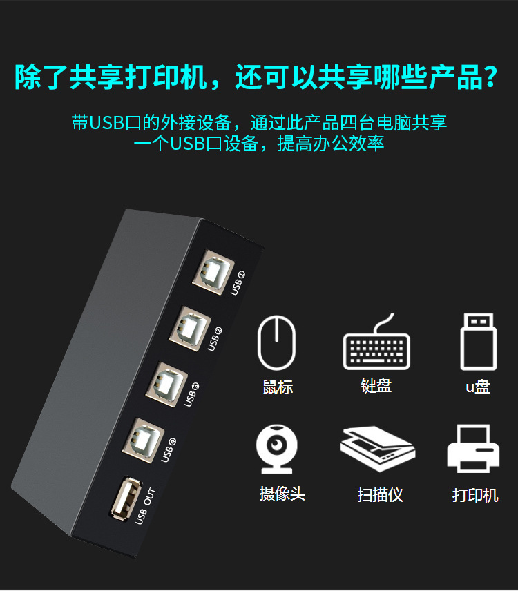 打印线切换器电脑1进4多口共用分享器USB打印机共享器2口分线器