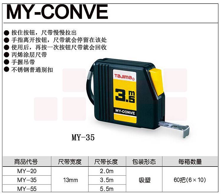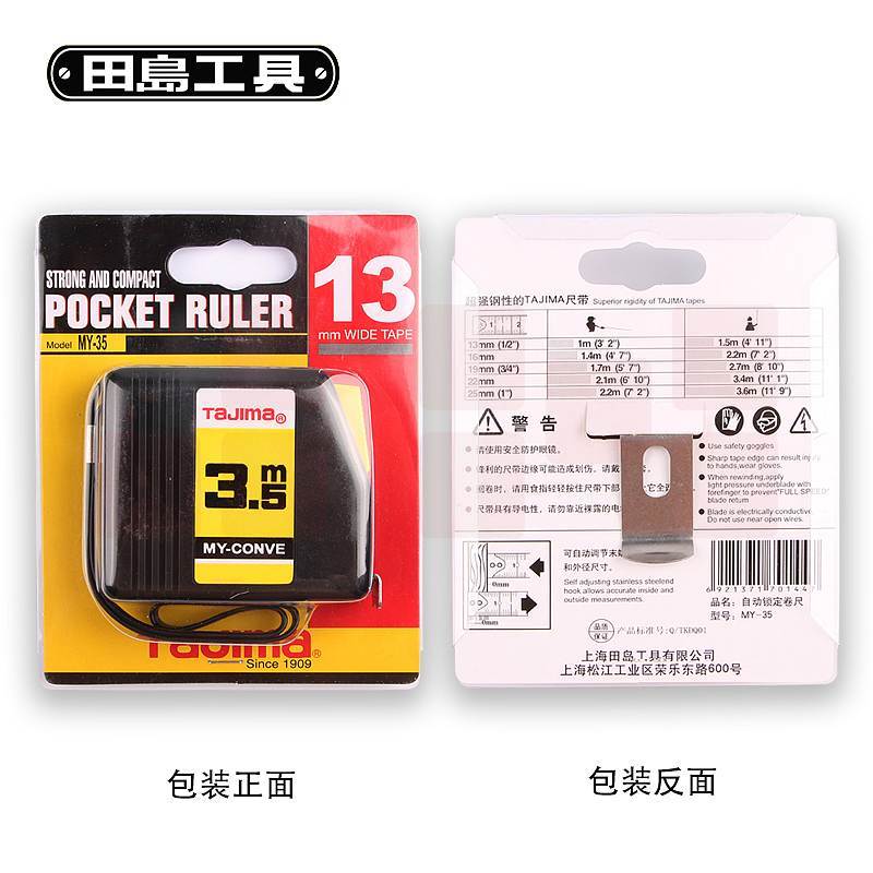 品牌:日本田岛; 尺寸:尺带3.5M*13mm; 材质:尺带进口SK85钢,弹簧进口SK85钢,尺壳ABS树脂,JIS1级,0点补正移动尺爪,另配手带,测量精密,简单,方便; 包装规格:6把/盒/60把/箱;