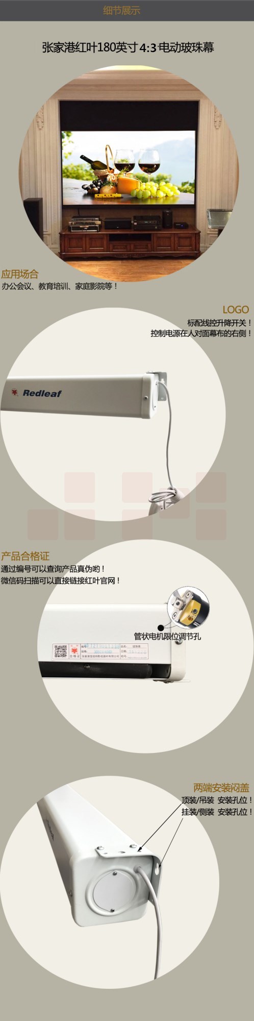 红叶(HONGYE)180英寸4:3电动玻珠白塑银幕 玻珠 3.66*2.77