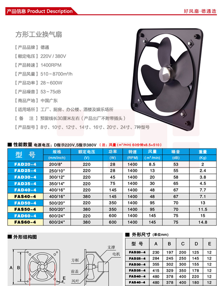 德通 FAD20-4/220v/28w 方格扇(工业排风扇)