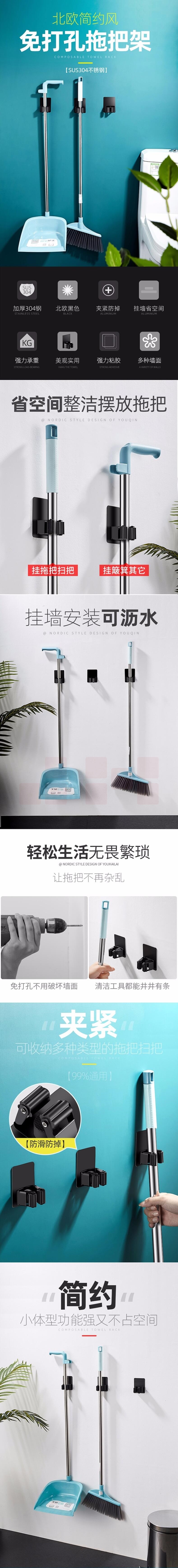 免打孔拖把夹挂钩贴 壁挂拖把神器 卫生间置物挂钩 3个/组 货号:JC