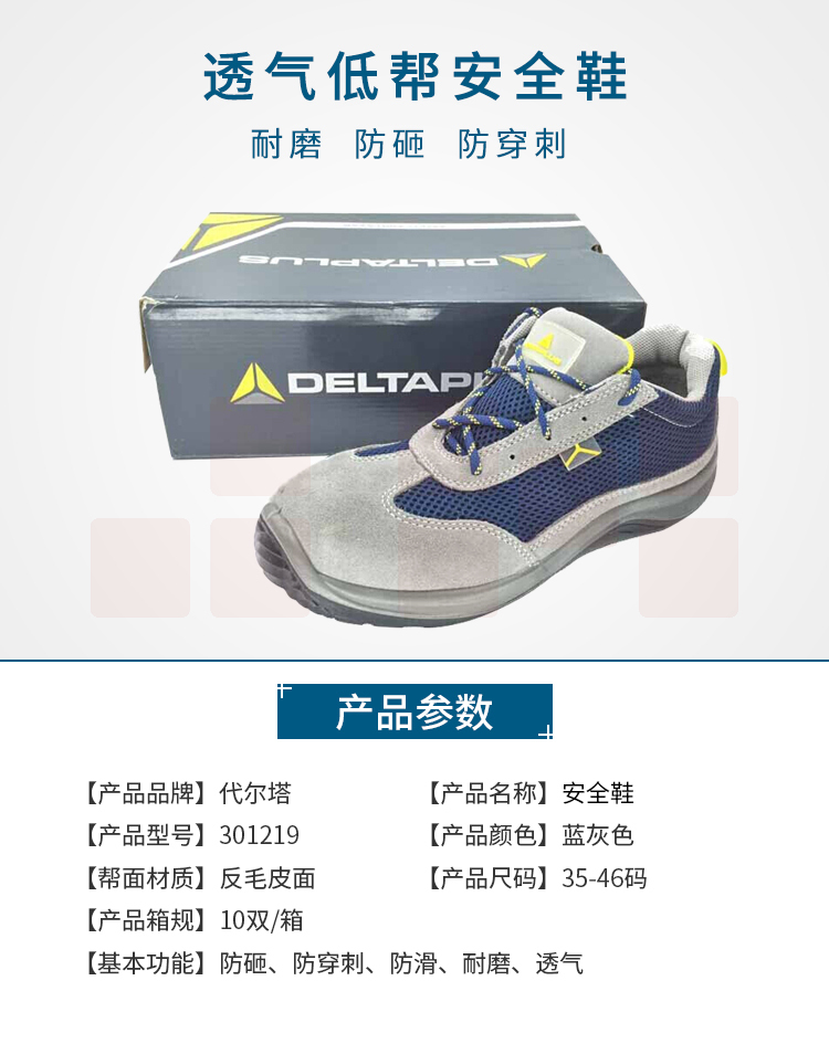 代尔塔 301219 防砸防刺穿耐磨透气低帮安全鞋 蓝灰色