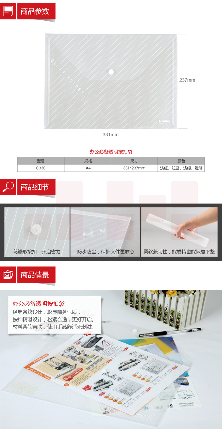 齐心 C330 A4透明按扣文件袋 蓝色10个