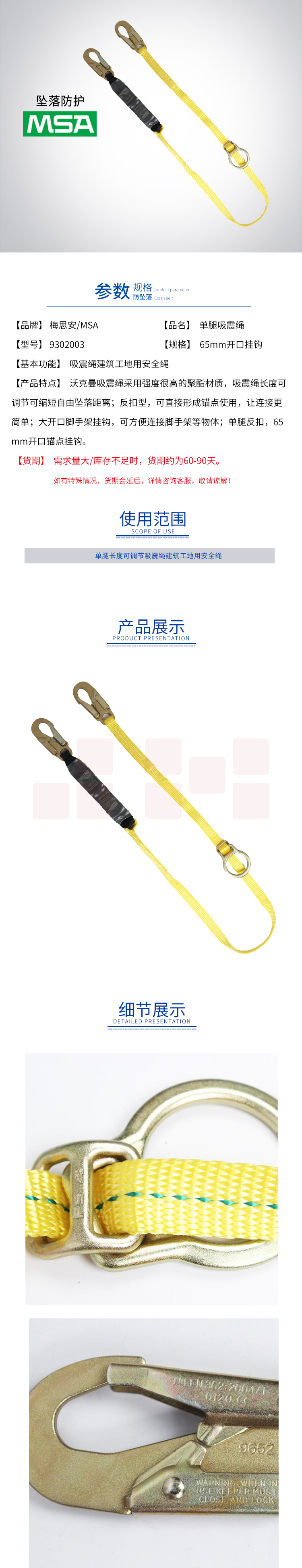 梅思安/MSA 9302003单腿吸震绳 长度可调节 65mm开口锚点挂钩