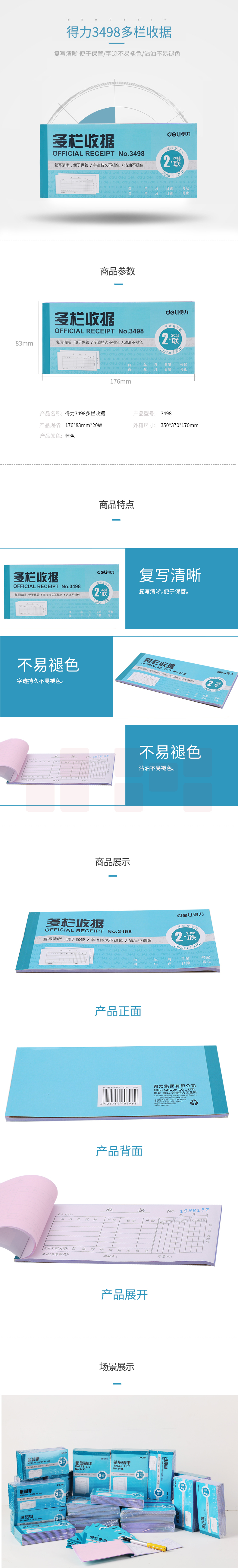 得力 收据 无碳复写二联多栏收据 单据 10本/包 单本价格 3498