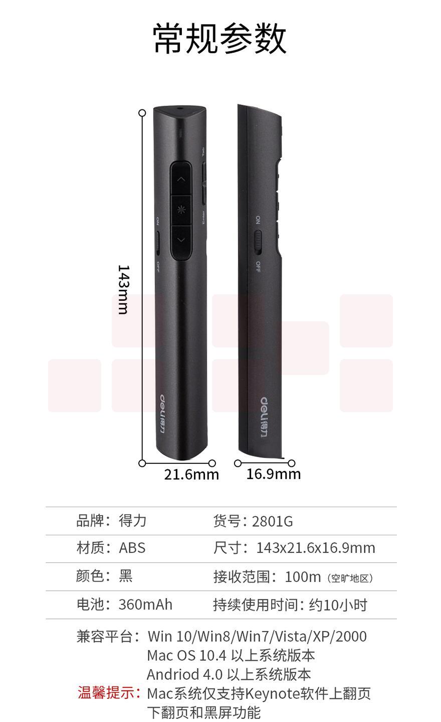 得力 激光笔 激光翻页笔 PPT幻灯片遥控翻页笔 电子笔演讲笔无线激光演示笔翻页器 白色 2801G