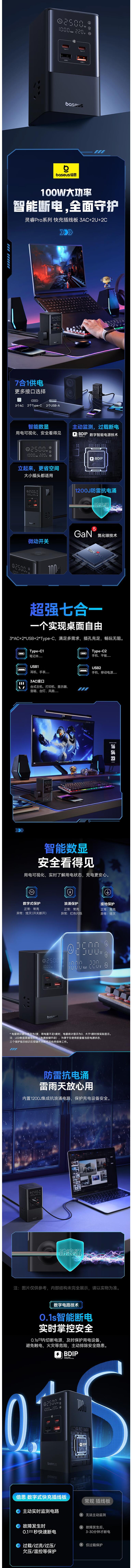 倍思 100W智能数显插线板 插座 氮化镓快充智能插座 货号:YC