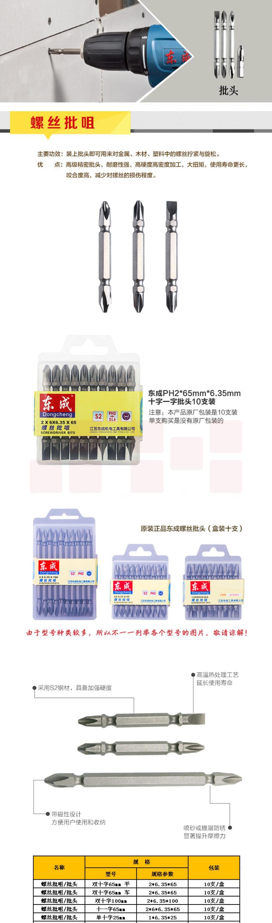 东成 批头65mm螺丝批咀10支装 螺丝批头双头十字批头 2*6.35