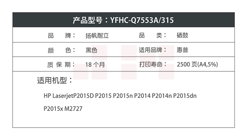 扬帆耐立YFHC Q7553A/315黑鼓(带芯片)2015D P2015 P2015n P2014 P2014n P2015dn P2015x M2727