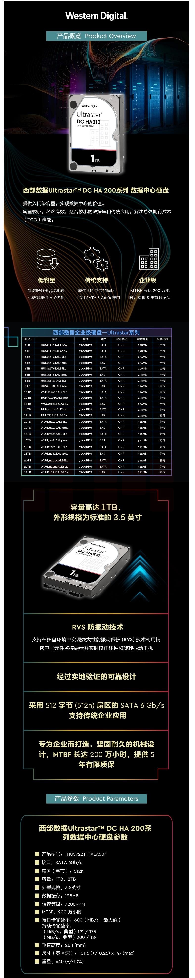 西部数据 6TB SATA6Gb/s 7200转256M HUS726T6TALE6L4 企业级硬盘