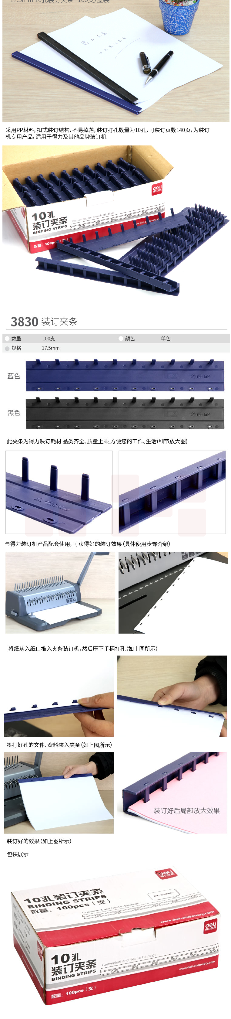 得力(deli)3830 黑色 10孔装订夹条 17.5mm 100支/盒