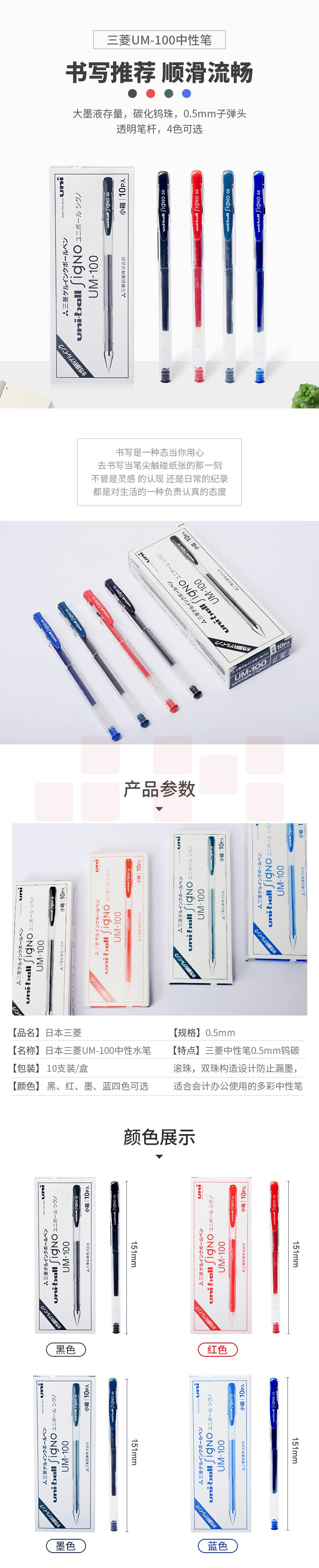 三菱(Uni)UM-100学生用中性笔签字笔蓝色0.5mm 10支装