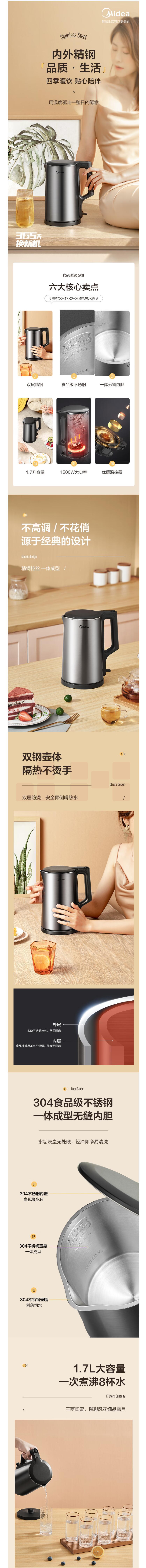 美的 电水壶 热水壶304不锈钢 1.7L大容量烧水壶 SH17X2-301