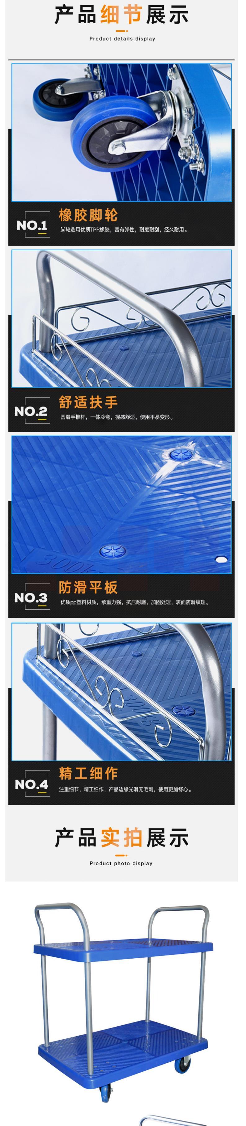 双层平板手推车 双扶手两层搬运车 拉货车 60*90cm 无护栏 承重300kg 货号:JC