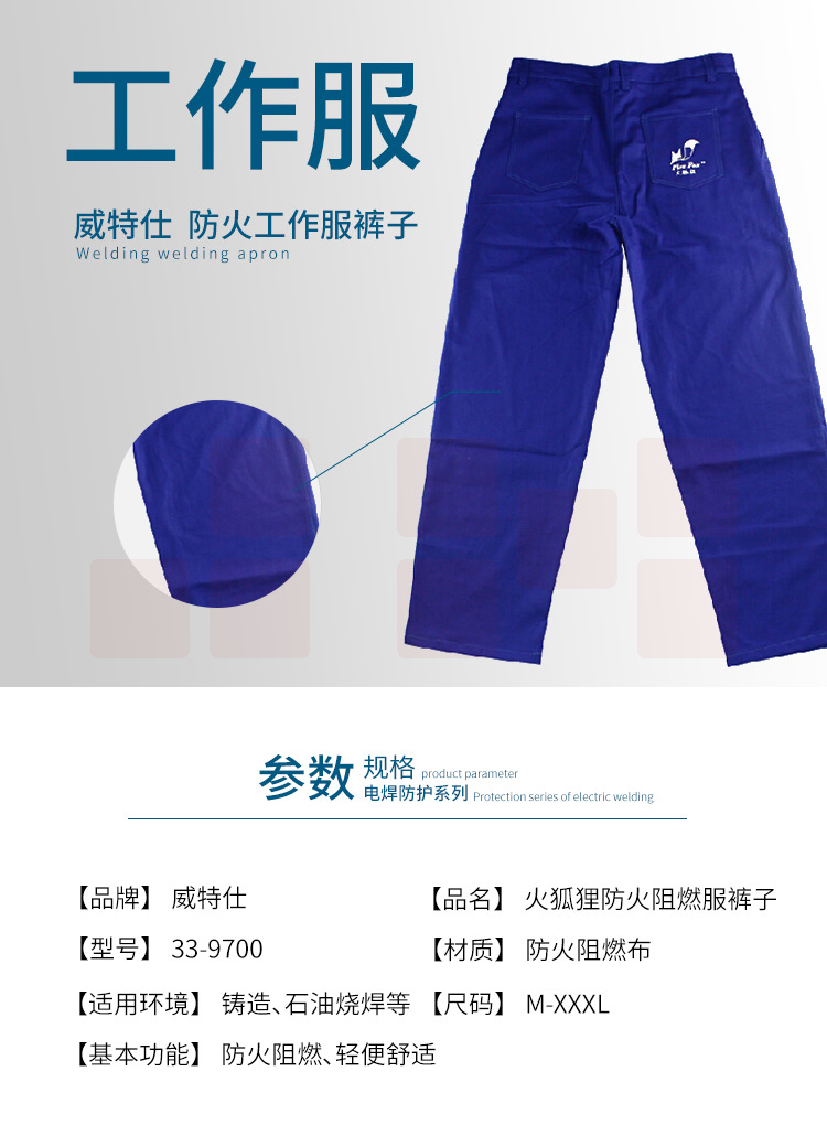威特仕 / WELDAS 33-9700 火狐狸蓝色电焊工作裤阻燃棉材质 适合烧焊铸造石油化工机电等场合 XL 1条