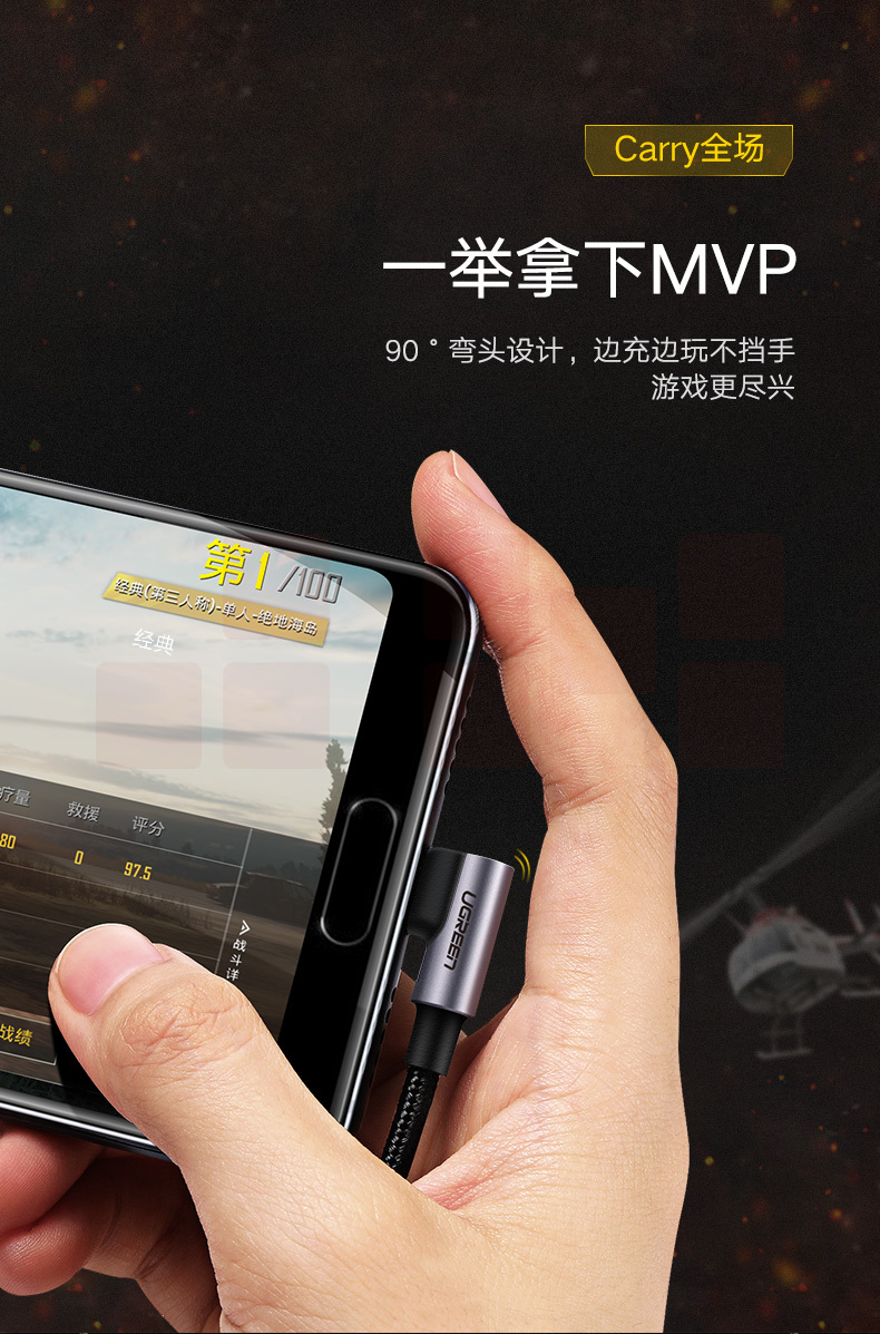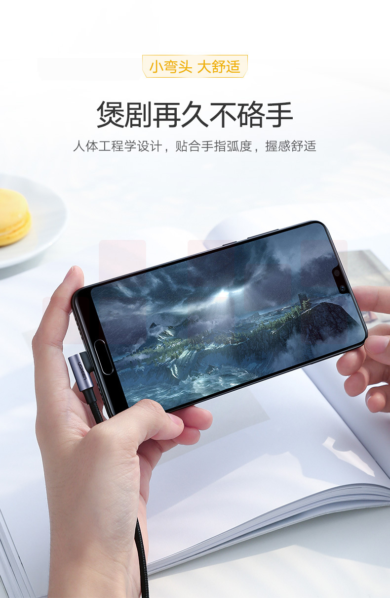 绿联 Type-C数据线弯头 安卓充电器线usb转接快充线通用华为P20荣耀v10小米8/9三星s8vivo手机1米黑50941