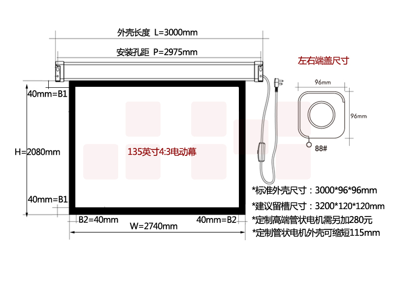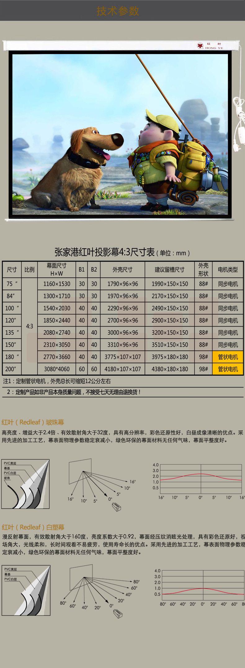 红叶(HONGYE)电动投影幕布135寸4:3白塑幕玻珠幕白玻纤高清幕布 2.74*2.08
