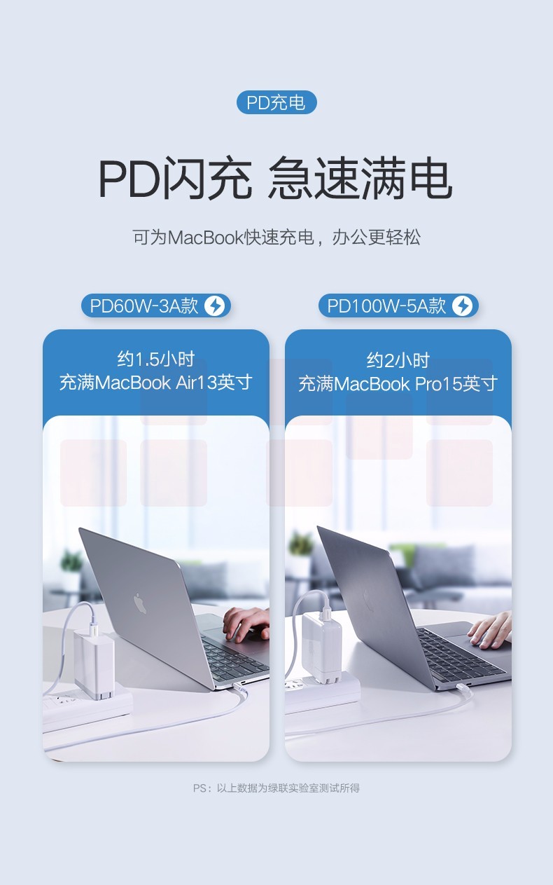 绿联 双头Type-C数据线 USB-C公对公3A PD快充线充电器线转接头通用iPadPro苹果MacBook华为MateBook1米60518
