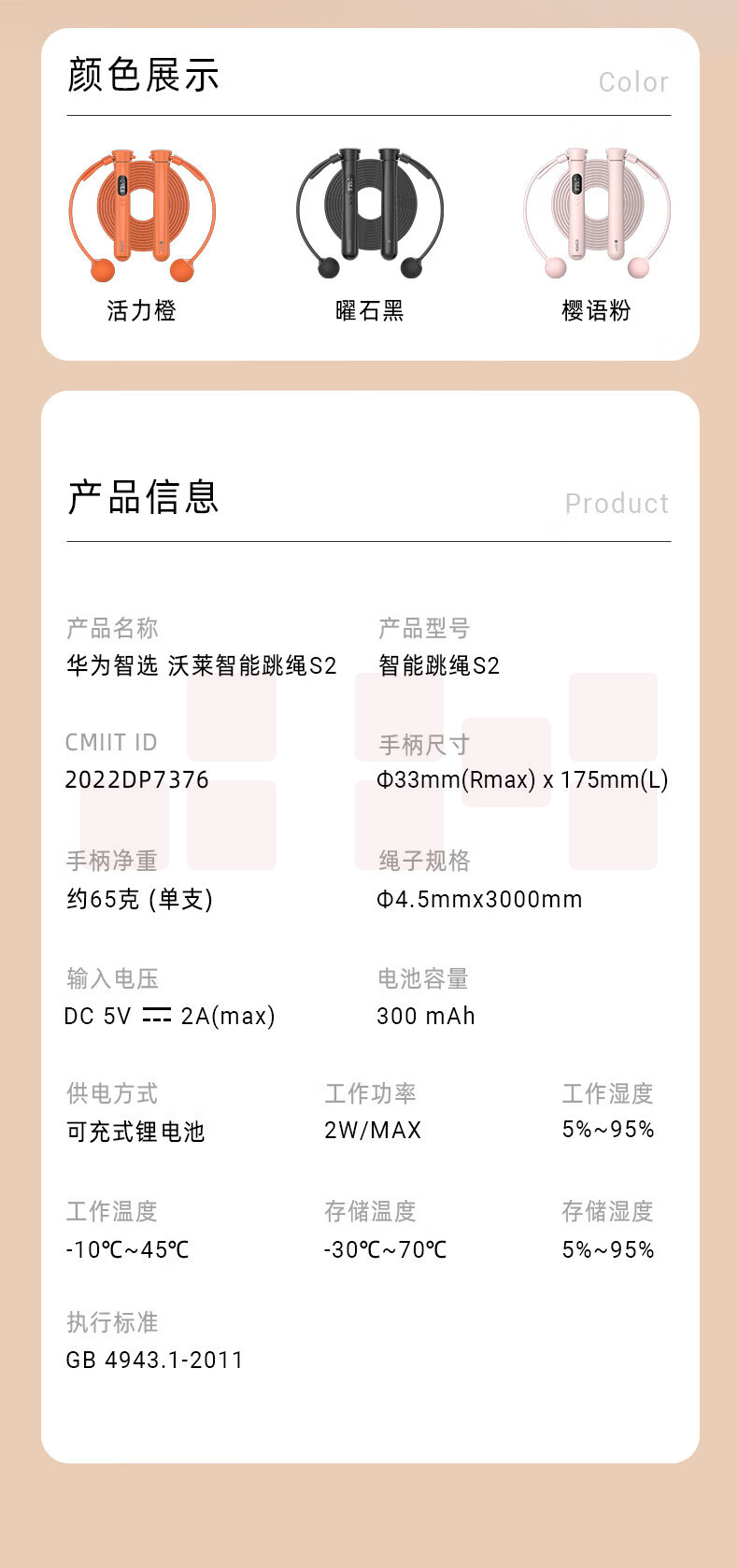 华为智选 沃莱智能跳绳S2 无绳跳绳成人计数跳绳学生儿童跳绳 曜石黑